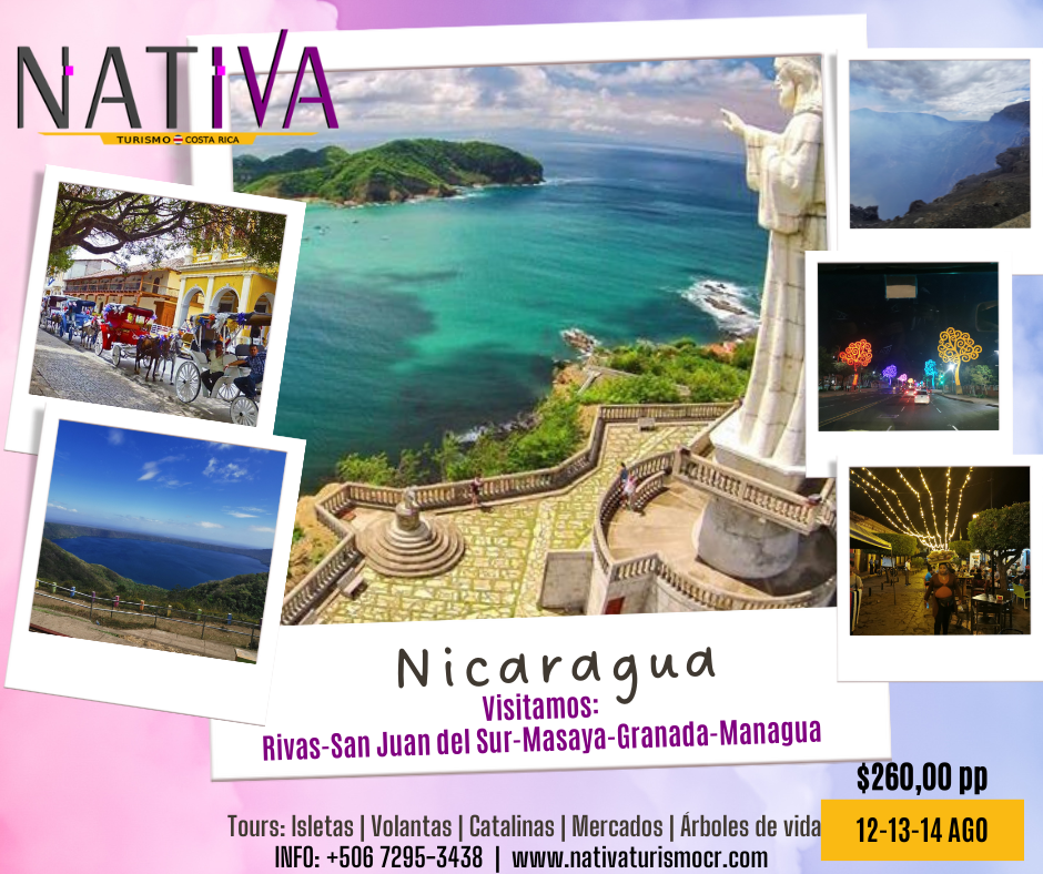 • Tours: Isletas, Volantas, Catarina viewpoint, trees of life of Managua, La Calzada, Cristo Redenetor viewpoint, Masaya volcano